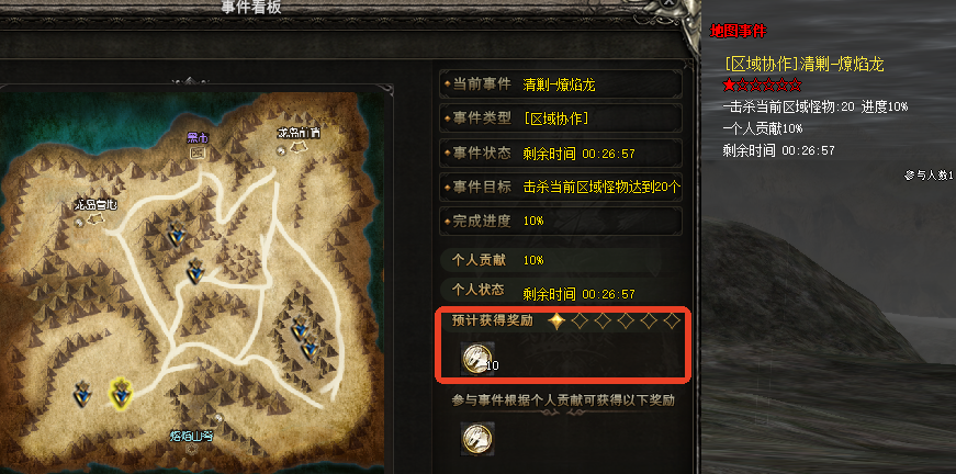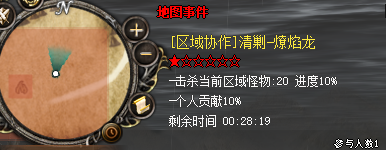 3.触发后主界面会显示事件目标、进度、个人贡献值、预计获得奖励的星级、事件剩余时间,小地图中也会显示事件的范围。