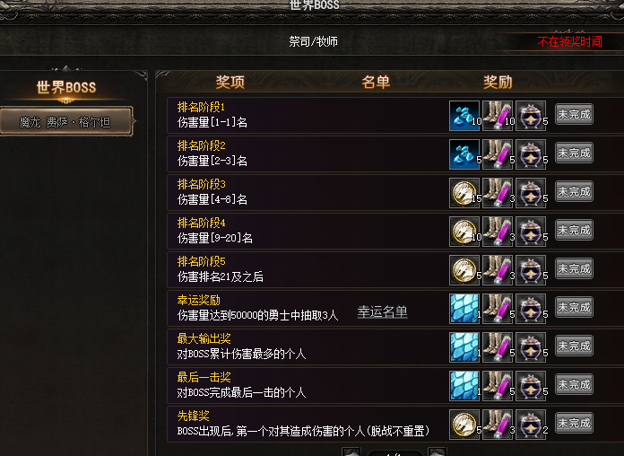 ※若击杀世界BOSS的过程中,BOSS脱离战斗将重置除先锋奖以外的所有累计数据。