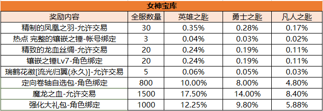 5.活动期间,女神宝库掉落概与个人宝库掉落概率互不影响。